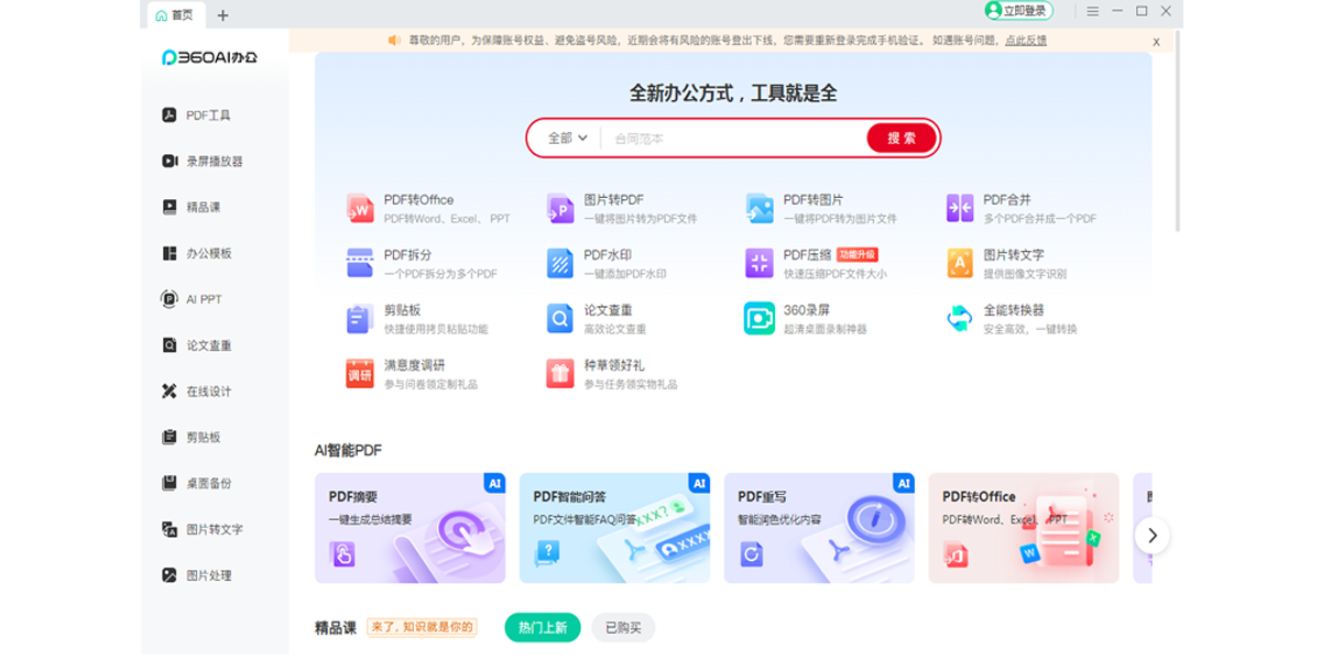 苏打办公(已升级为360AI办公)是一款主打简约、高效的办公平台,苏打办公的产品理念是让办公成为轻松的事。苏打办公集成PDF阅读、PDF转换、PDF合并拆分、图片识别文字等功能,并…