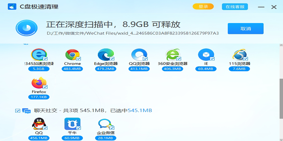 C盘极速清理是一款专业释放C盘空间的系统工具,一键极速清理系统垃圾、软件垃圾、微信聊天垃圾,释放海量C盘空间,提升电脑使用寿命,解决因C盘爆满而导致的电脑卡顿问题。