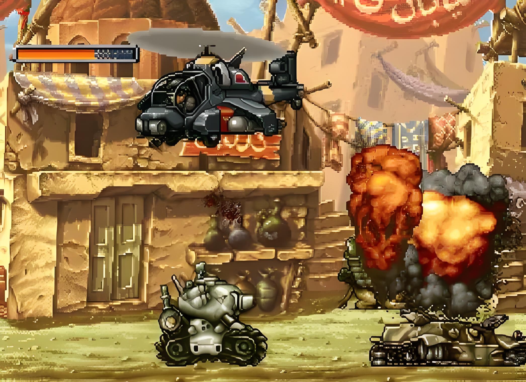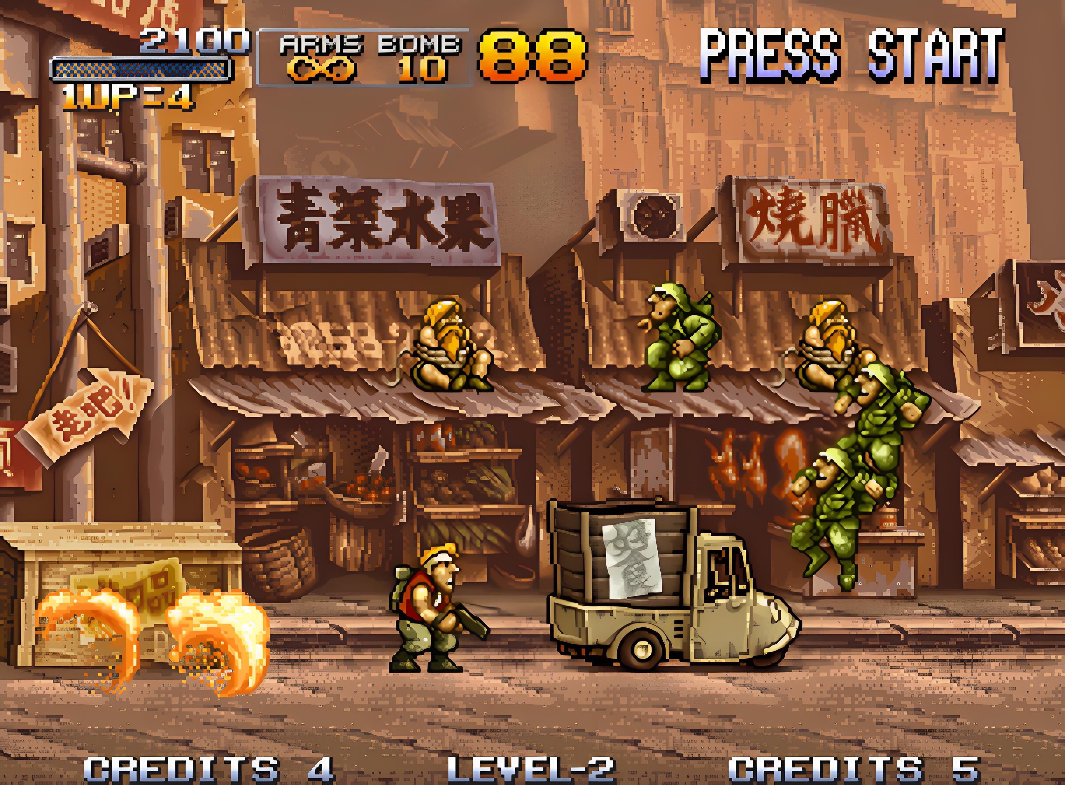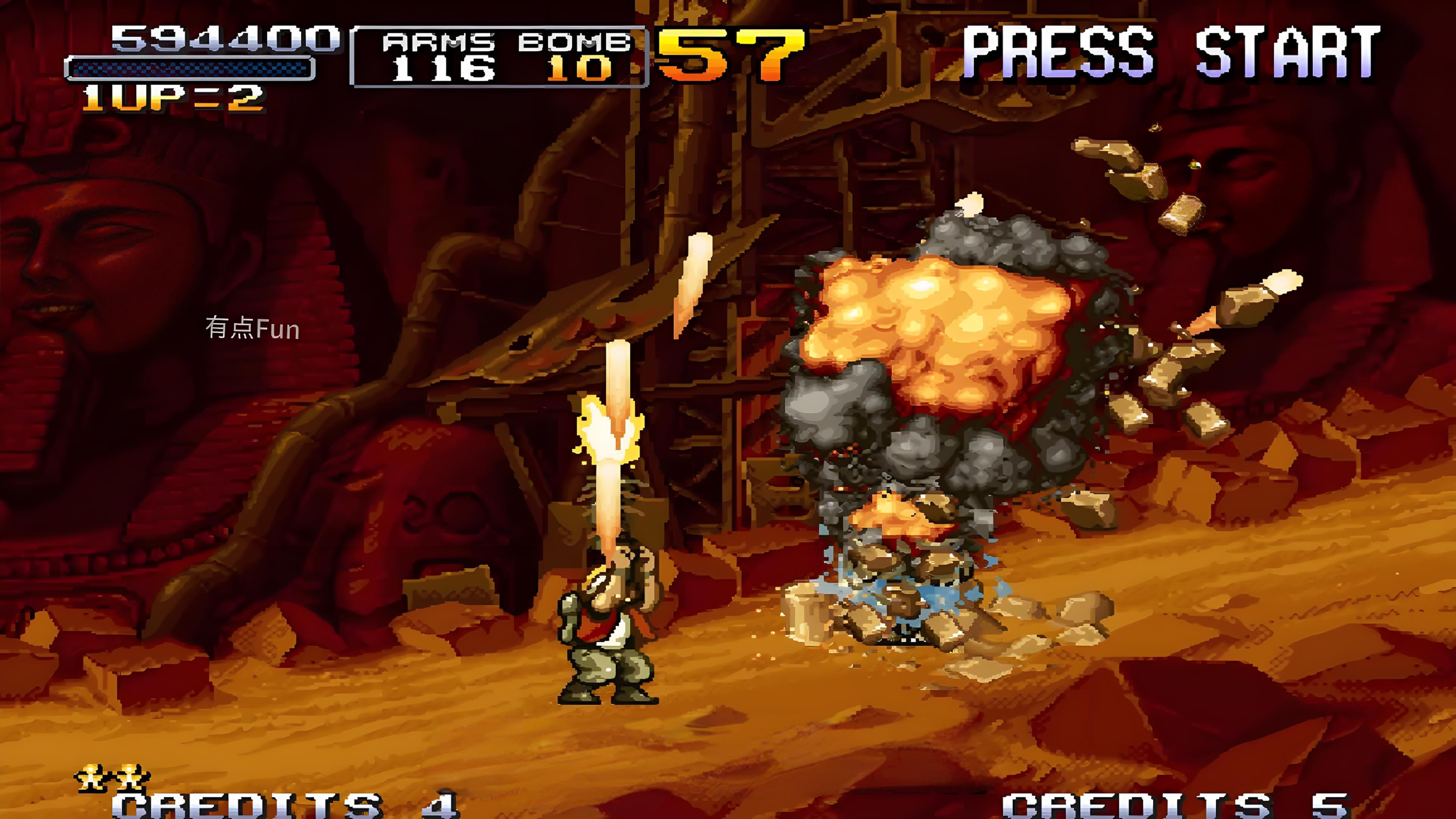 玩家在游戏中扮演不同的角色,在横版的地图中不断向右探索,使用武器击败敌人,部分地图中还有特殊的载具可以驾驶。
