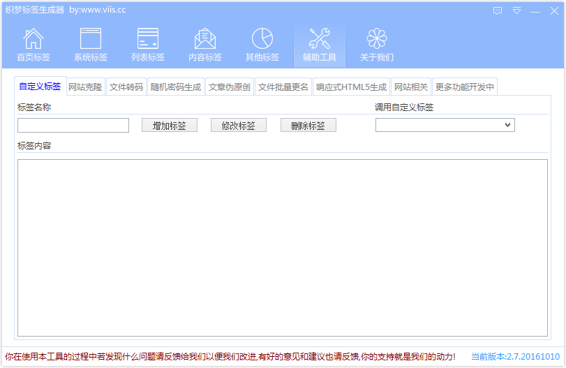唯爱织梦标签生成器是一款绿色小巧而且还永久免费的标签生成工具,小巧实用、不足2M,但是功能却不受影响,界面简洁大方,你可以快速灵活的生成你所需要的dedecms标签,生成标签自动复…
