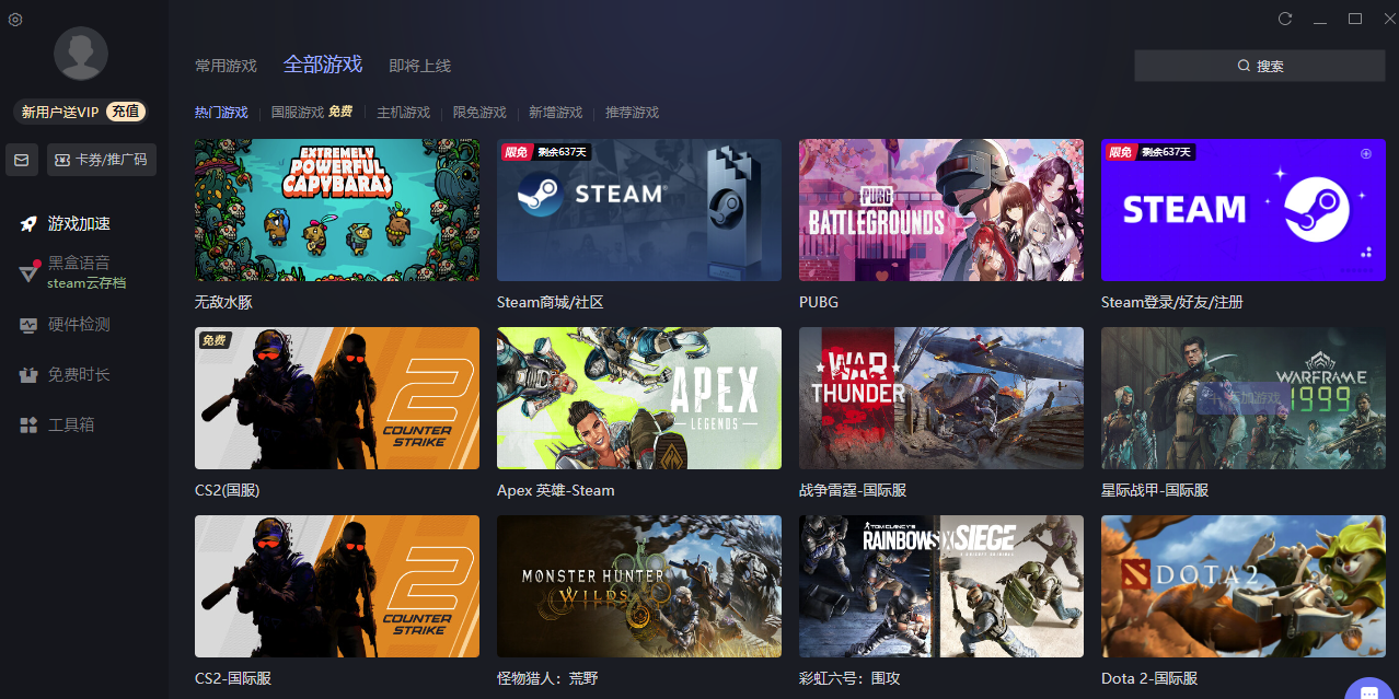 小黑盒加速器 - 全球专线加速,游戏网络专家。全面支持绝地求生、DOTA2、刀塔自走棋、Steam、彩虹六号、CSGO、Apex、LOL英雄联盟、H1Z1、堡垒之夜、NBA、方舟、…