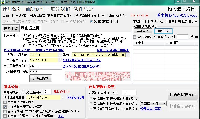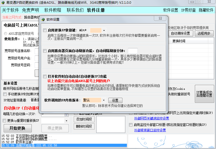 易变通IP自动更换软件官方版是一款辅助换ip的软件,软件的功能是将你ADSL手动拨号换ip的过程通过软件来实现,使用ADSL拨号过程可以用电脑拨号或路由器拨号进行代替。