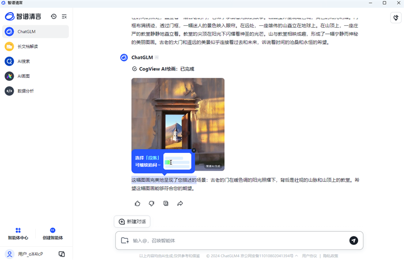 智谱清言,拥有千亿参数对话模型,支持多轮对话,具备内容创作、信息归纳总结等能力。基于ChatGLM中英双语大模型开发,通过万亿字符的文本与代码预训练,结合有监督微调技术,具备通用问…