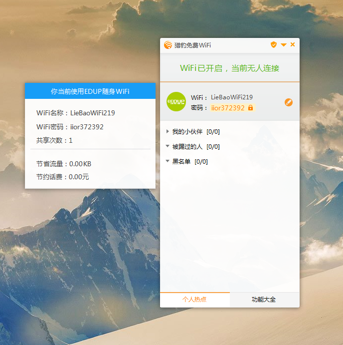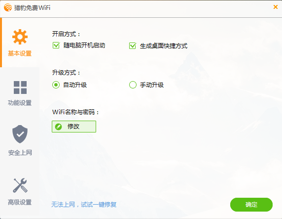 猎豹免费WiF由金山网络推出的一款免费、极简的WiFi共享软件,用户只需下载并运行猎豹免费WiFi,电脑瞬间就可以变成免费的无线i路由器,手机平板就能愉快地上网啦!