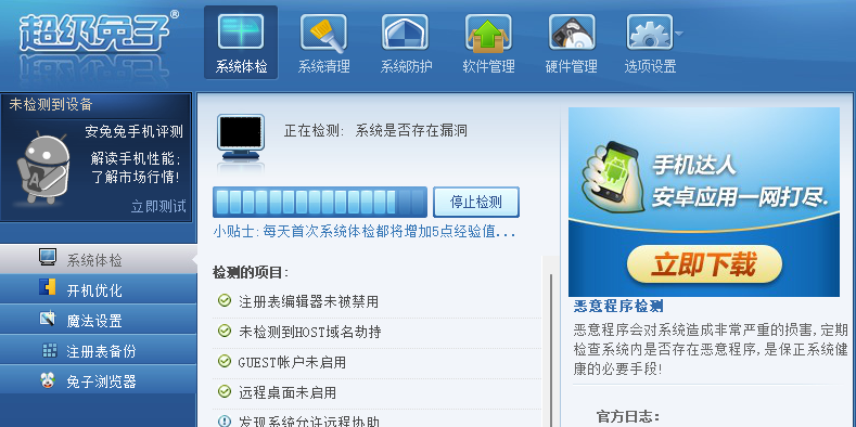 超级兔子官方版是一款超级强大的电脑系统优化工具,可以诊断一台电脑系统的CPU、显卡、硬盘的速度,由此检测电脑的稳定性及速度,还有磁盘修复及键盘检测功能。超级兔子进程管理器具有网络、…