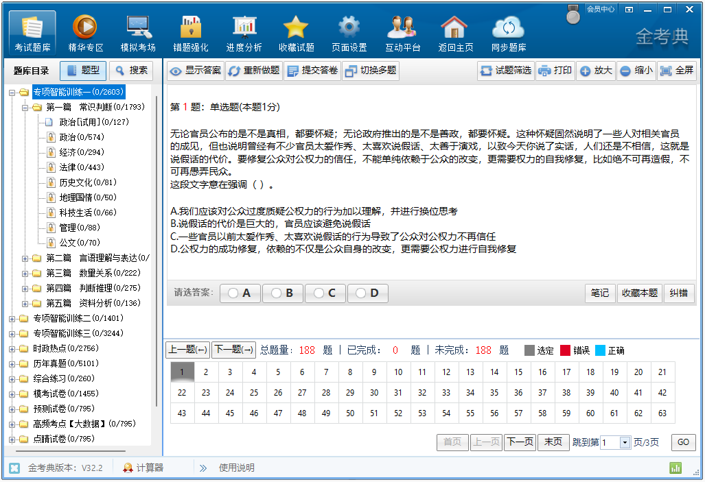 金考典考试软件,是建筑、医学、财务、从业资格、公务员等考试科目题库,主要内容为:章节练习,往年真题,模考软件预测。